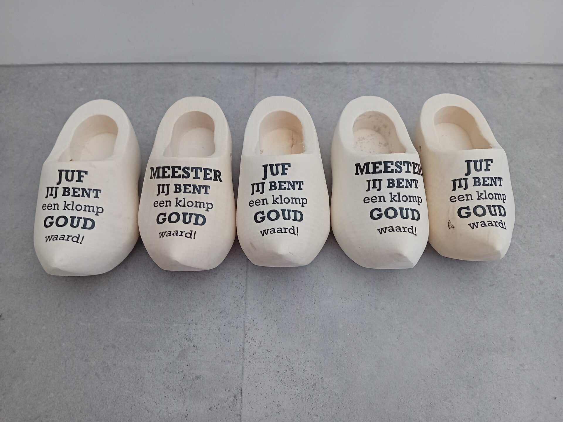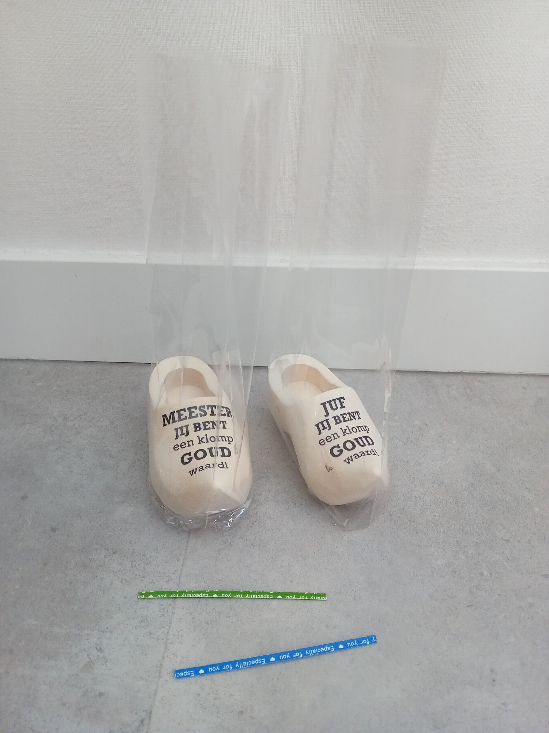 Houten klompjes met tekst.